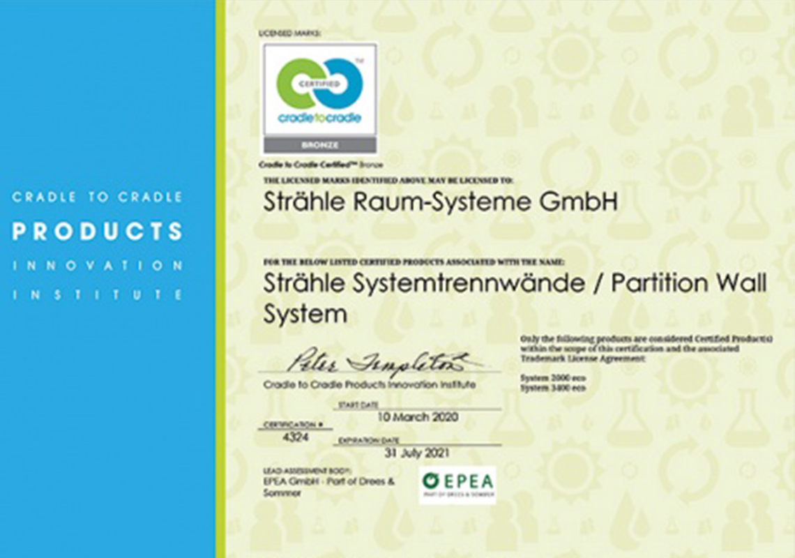 Thanks to compatibility with the System 3400 eco and the double-shell System 2000 eco full-wall or glass-wall variants, the system enables Strähle to implement interior design projects in accordance with the requirements of the Cradle-to-Cradle concept.