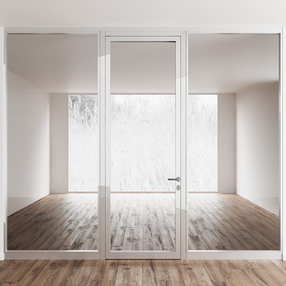 Fully glazed door with internal aluminium frame, flush on corridor and room sides