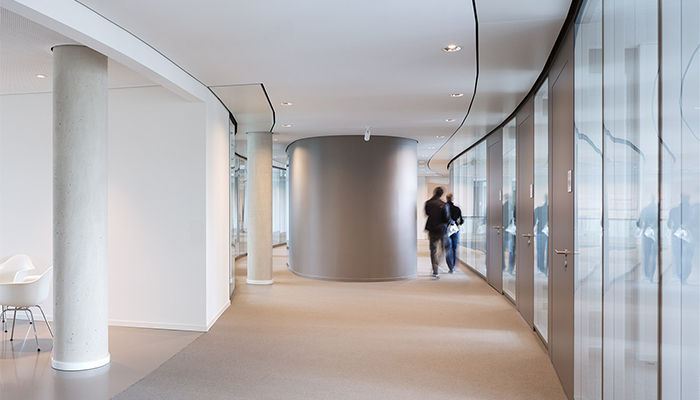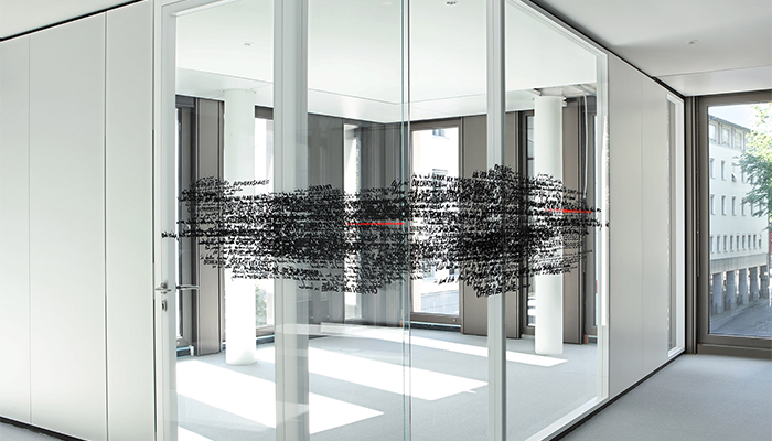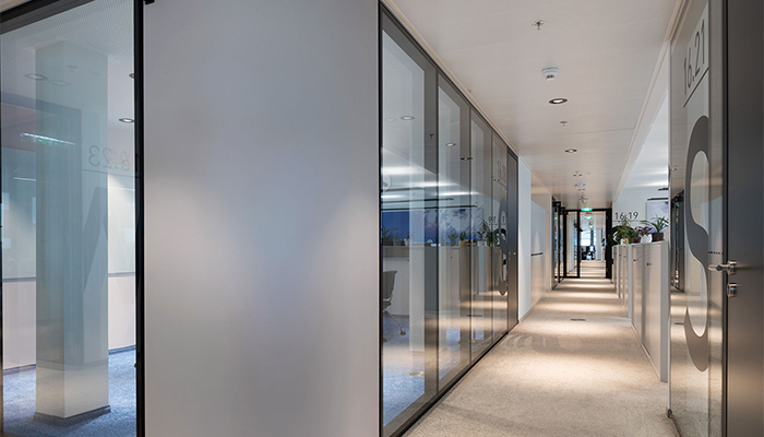 The state-of-the-art System 2300 partition wall system is the structural glazing variant of the System 2000 family. It is characterised by its mirror-like glass look and boasts high sound insulation levels. Like its system sibling, it is highly flexible and based on a modular system which uses the patented Strähle mullion construction with integrated suspension units. The glass is manufactured as fully glazed elements and inserted in the substructure on both sides.