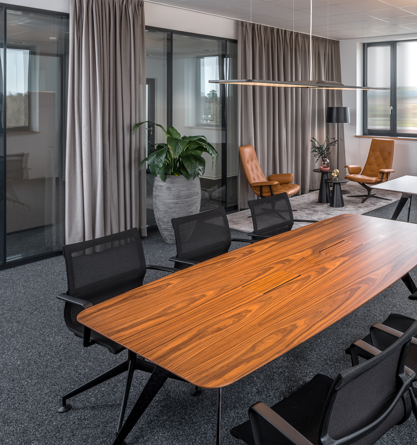 The MTS flush partition wall system in powder-coated black lends a sophisticated look to the office space. The partition wall system is designed with a mirrored effect and is perfect for projects that call for flexibility and modularity. Strähle’s partition wall and room-in-room systems perfectly complement the high design standards set by KAHL office furnishings.