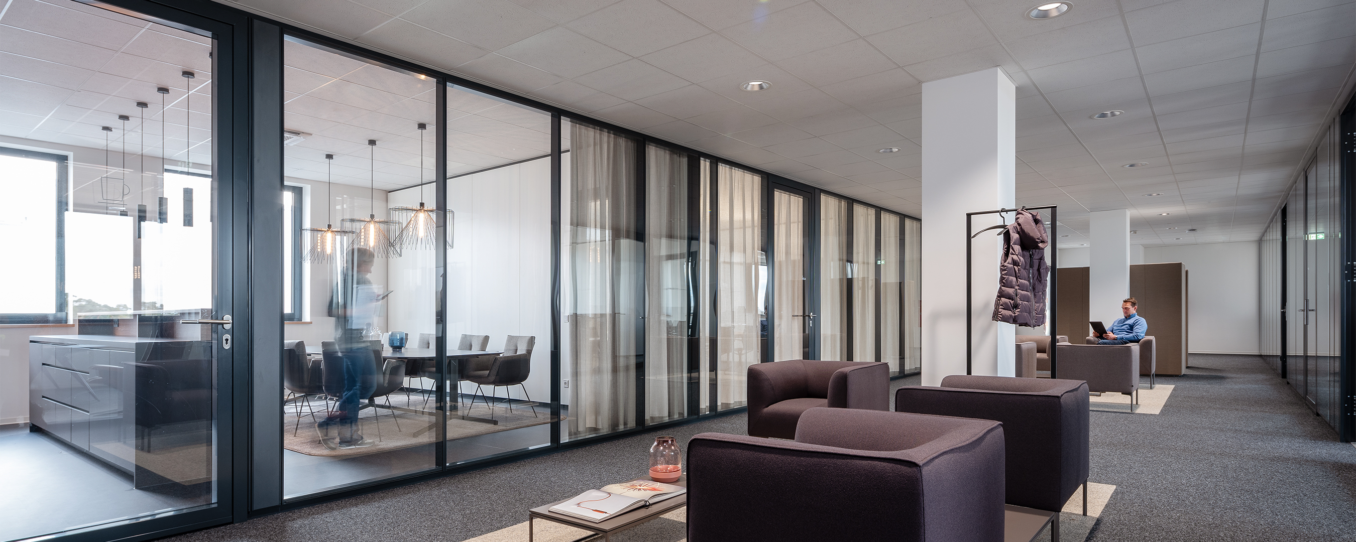 The design of their office space highlights transparency, discretion and the company’s innovative spirit, featuring both spacious, open areas and private rooms with glass partition walls. Room-in-room systems with a variety of furnishing options and acoustically designed curtains create quiet places to retreat to conduct meetings undisturbed. Strähle’s Kubus I Meeting system combines high-quality design with technology, functionality and quality. The all-glass cube creates a transparent retreat within open plan office areas. The system’s aluminium structure features externally flush single glazing for a smooth, elegant look without compromising on maximum acoustic insulation.