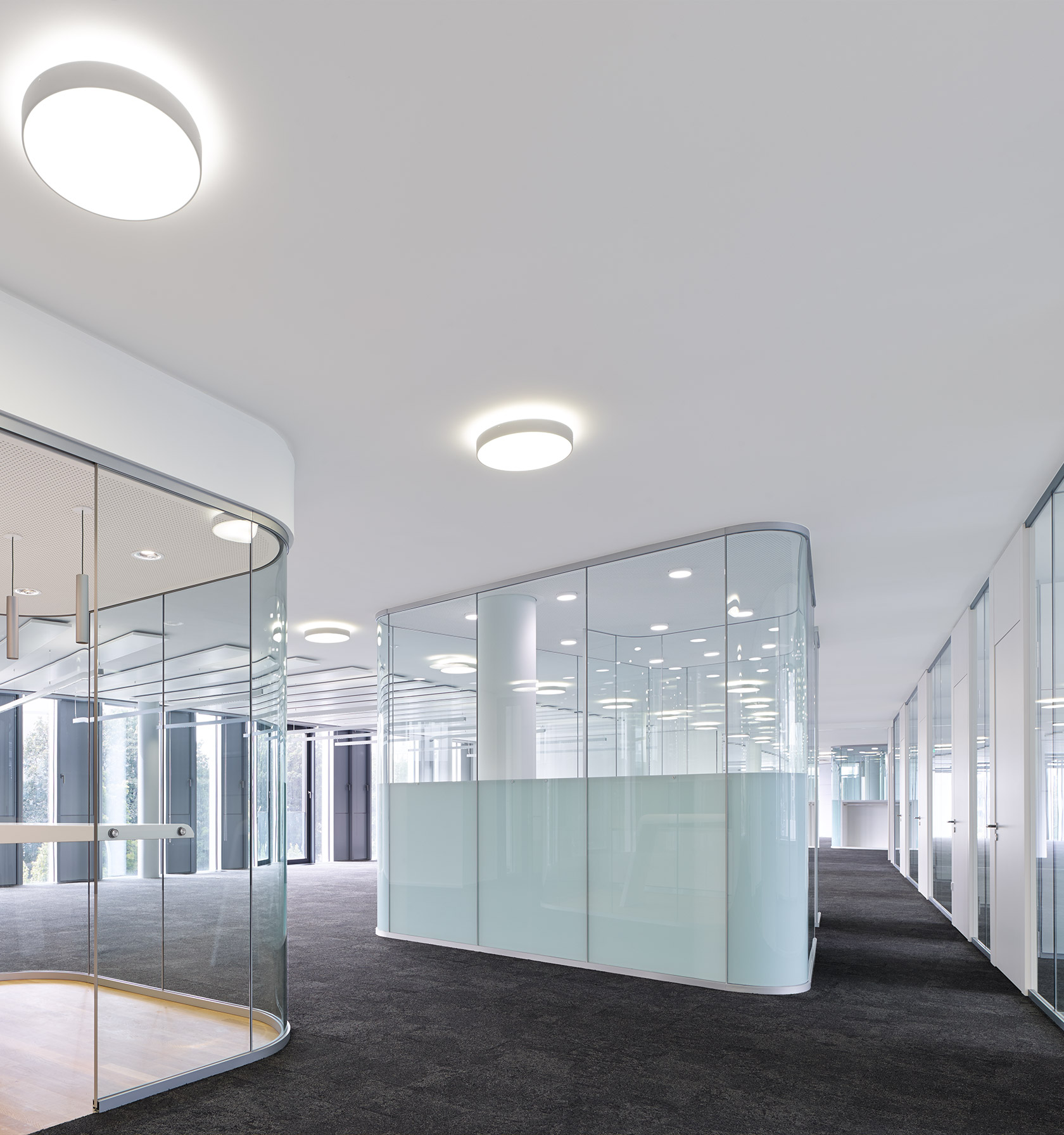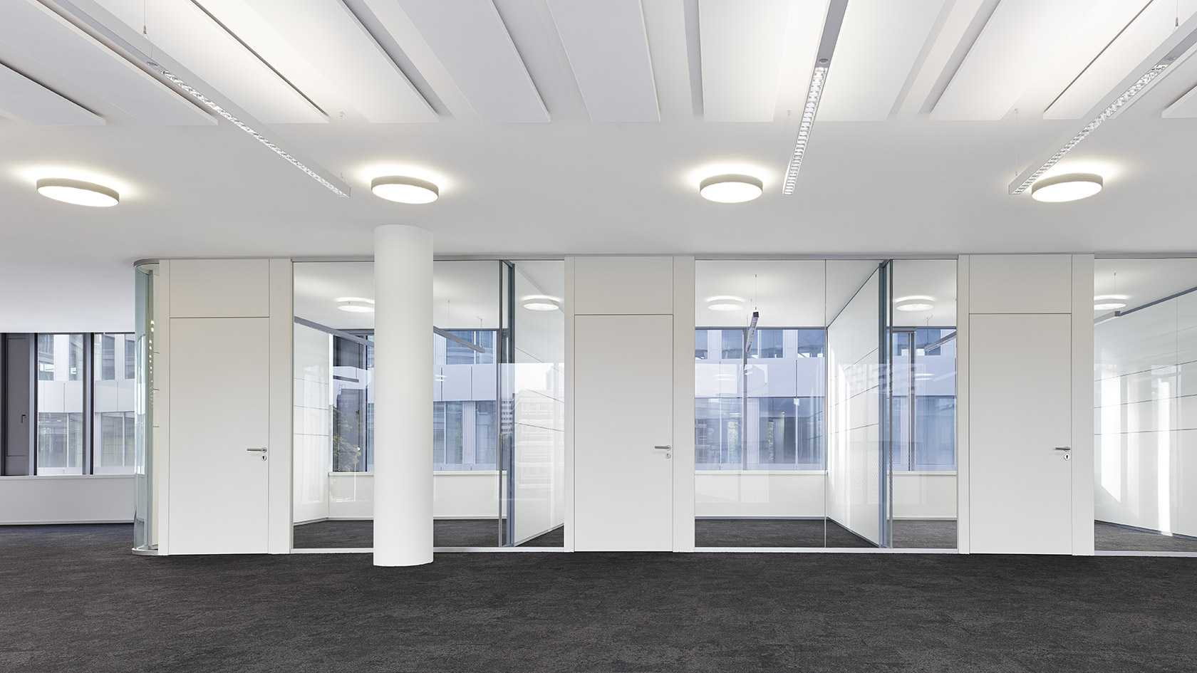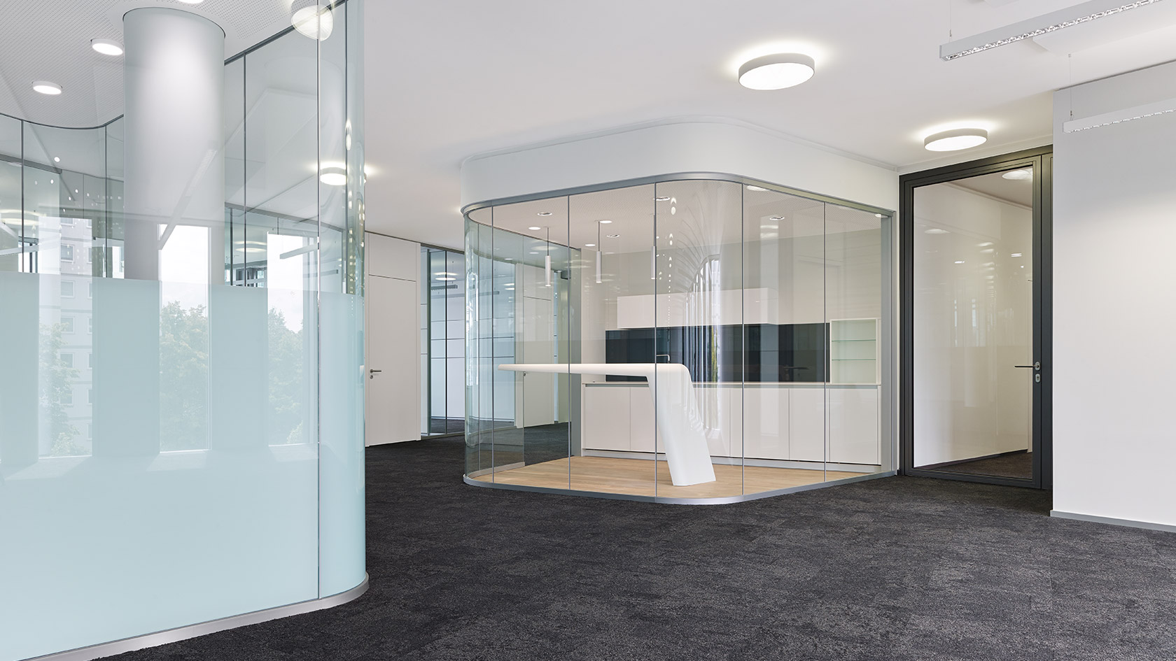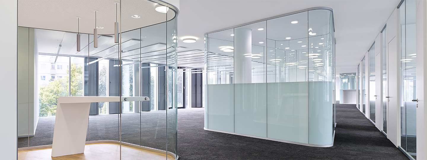 The technical specifications were implemented with the fully-glazed System 3400. The glazed partition walls with their rounded corners take up the lines of the façade. The system combines maximum transparency with a high degree of flexibility and economy without vertical posts.