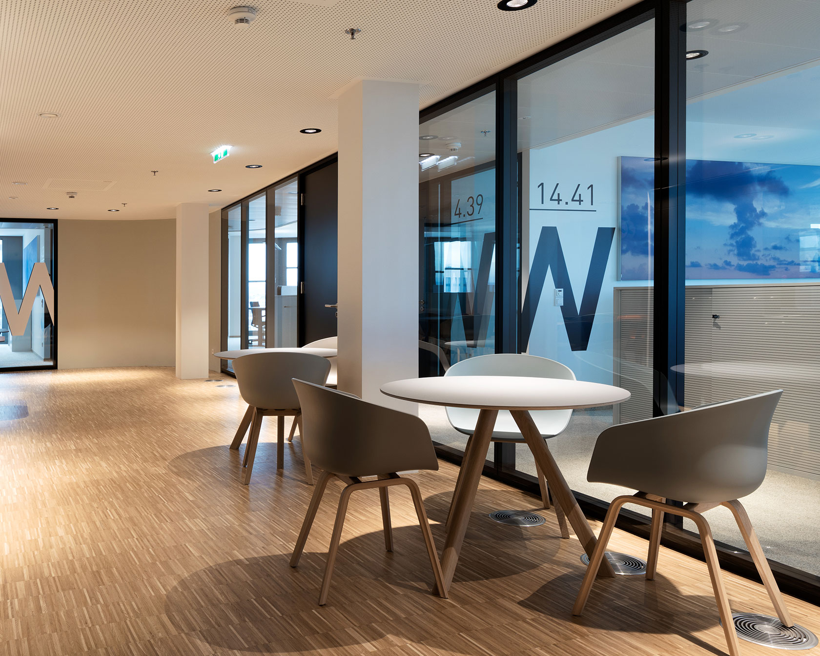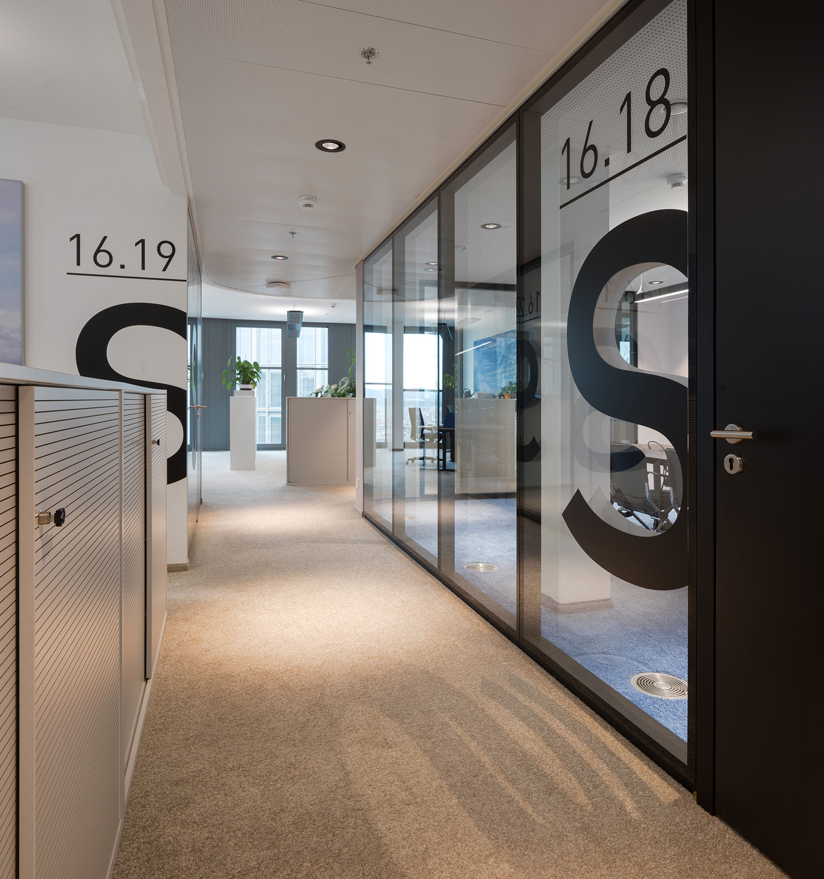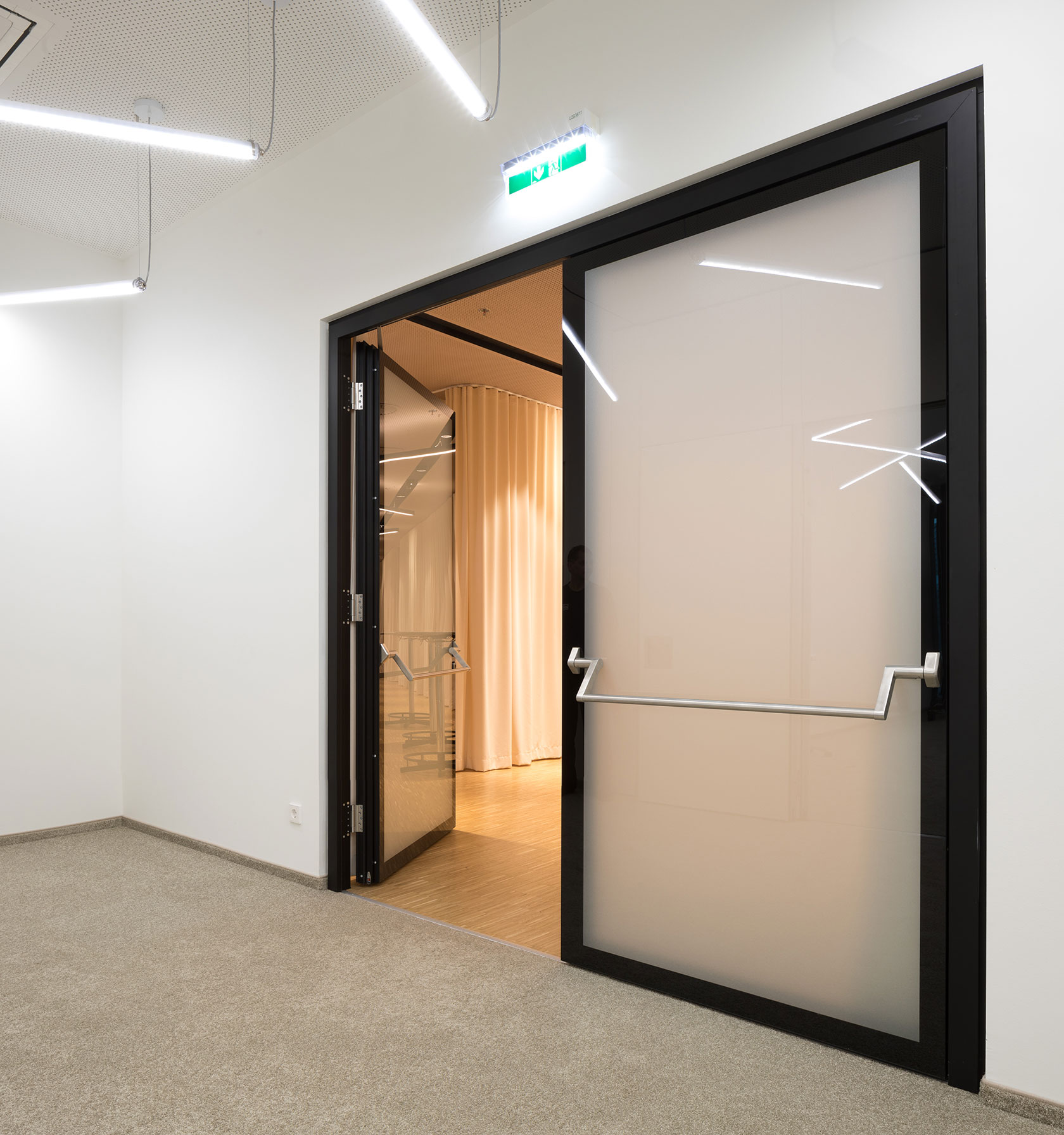 In the new office premises of Bawag at Vienna's main railway station, our Austrian system partner "inside by Strähle" has installed all-glass walls over seventeen floors. The flush surface of the Structural Glazing System 2300 with black powder-coated profiles gives the offices a sumptuous appearance. Black solid doors, flush-fit on the corridor side, provide high sound insulation for undisturbed, concentrated work. Large-scale adhesive films on the partition walls serve as a guidance system for staff. In the spacious conference room, fire protection doors with an escape function were installed.
