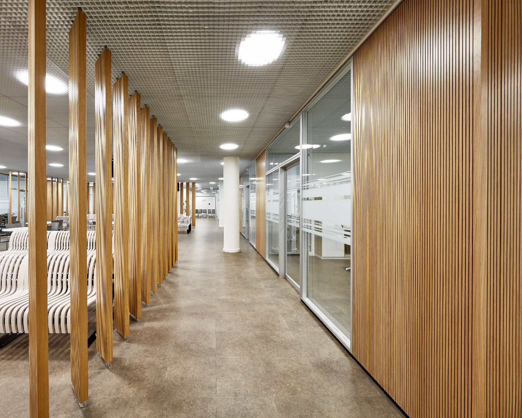 The interior is extremely light and pleasant thanks to the use of glass walls as well as different wooden elements and wooden acoustic slats. The double-shell System 2000 partition walls enable a particularly generous screen whilst also allowing plenty of daylight into the rooms. The ST 40 sound-insulating sliding door saves space and achieves discreet retreat areas. The concept allows for a variety of different conference rooms providing discretion for individual consultations.