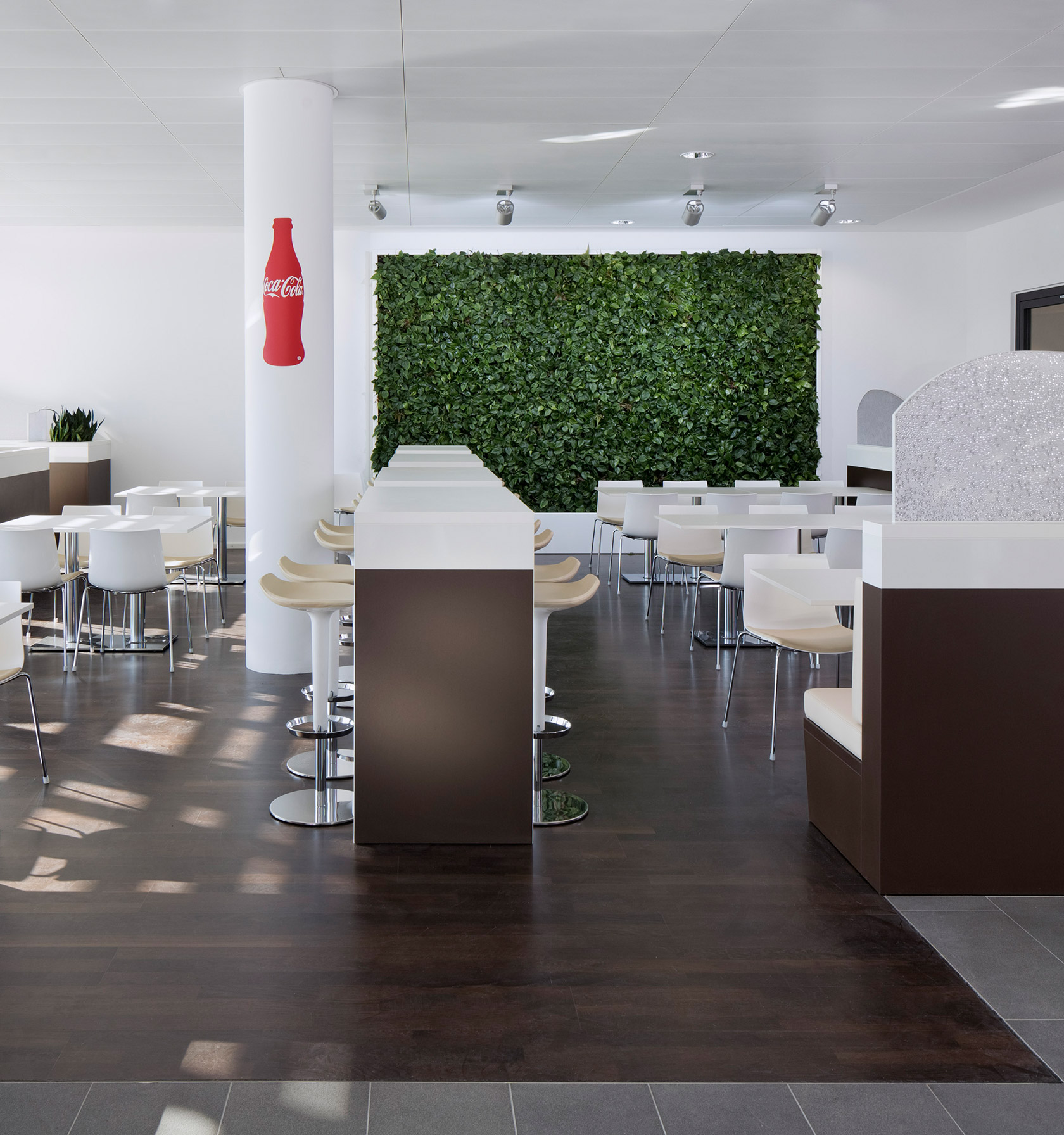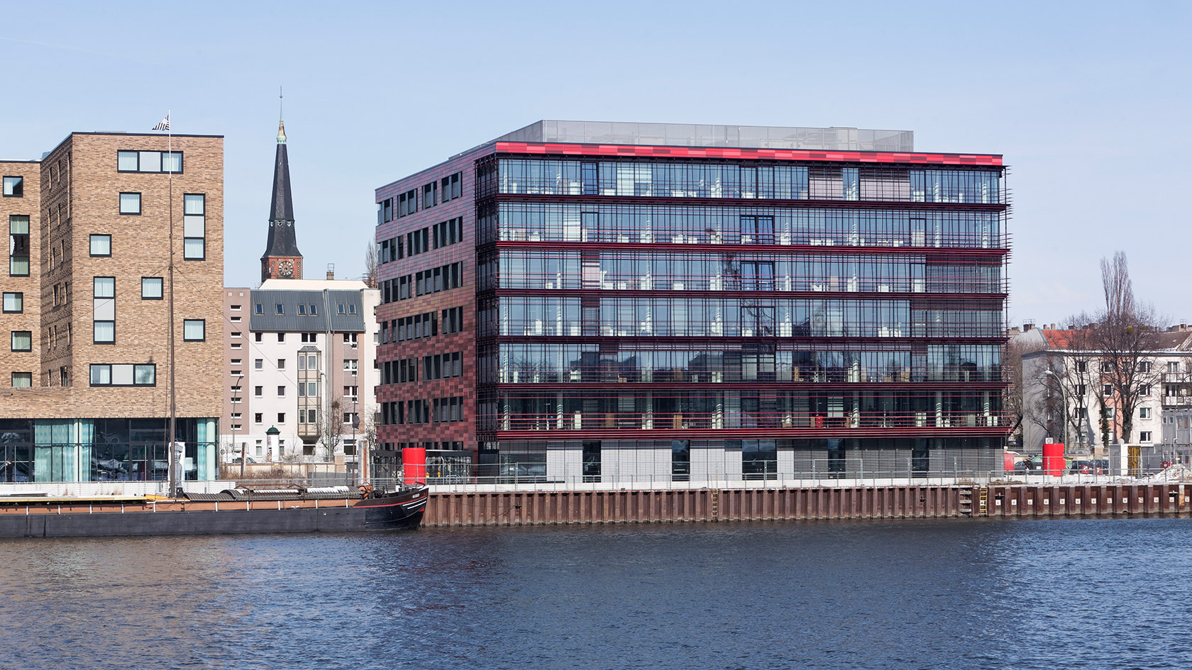 The new German Headquarters of Coca Cola is situated right next to the Berlin Spreeufer and provides modern work spaces for about 500 employees. This seven-storey building was custom-built by HOCHTIEF to the specific requirements of Coca Cola. The clear construction by nps tchoban voss is characterized by a large glazed front and wide window ledges, which cross the circular-red tiled Coca-Cola facade.