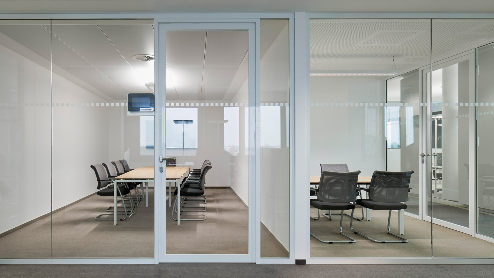 All floors utilise the same office layout and the floor plan delivers a supports a flat hierarchical construction. The cubic form of this point-block building enables the positioning of all work stations along the façades. Full height System 3400 glass partition walls divide the office spaces as well as the meeting rooms and allow for uninterrupted views both in and out of these spaces.