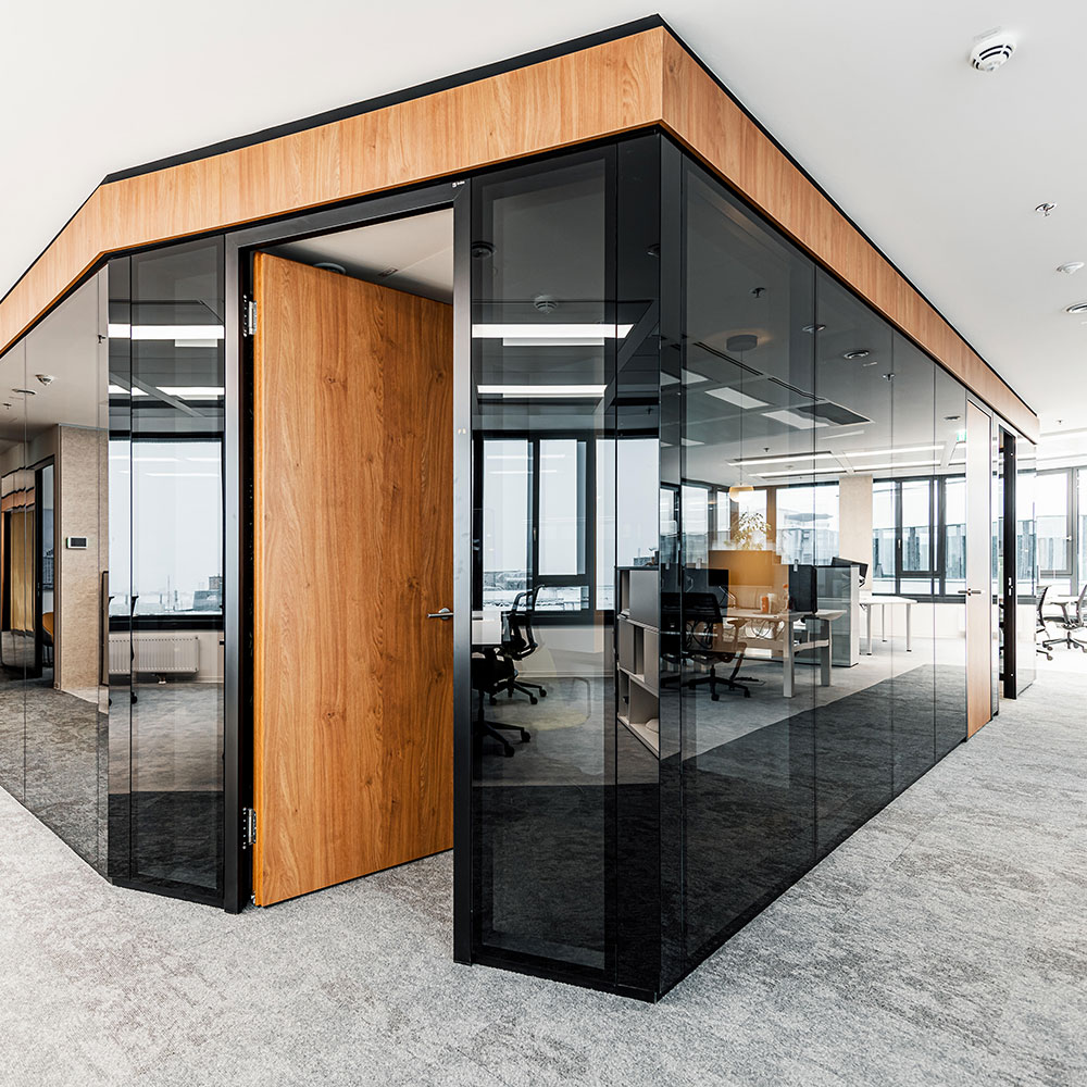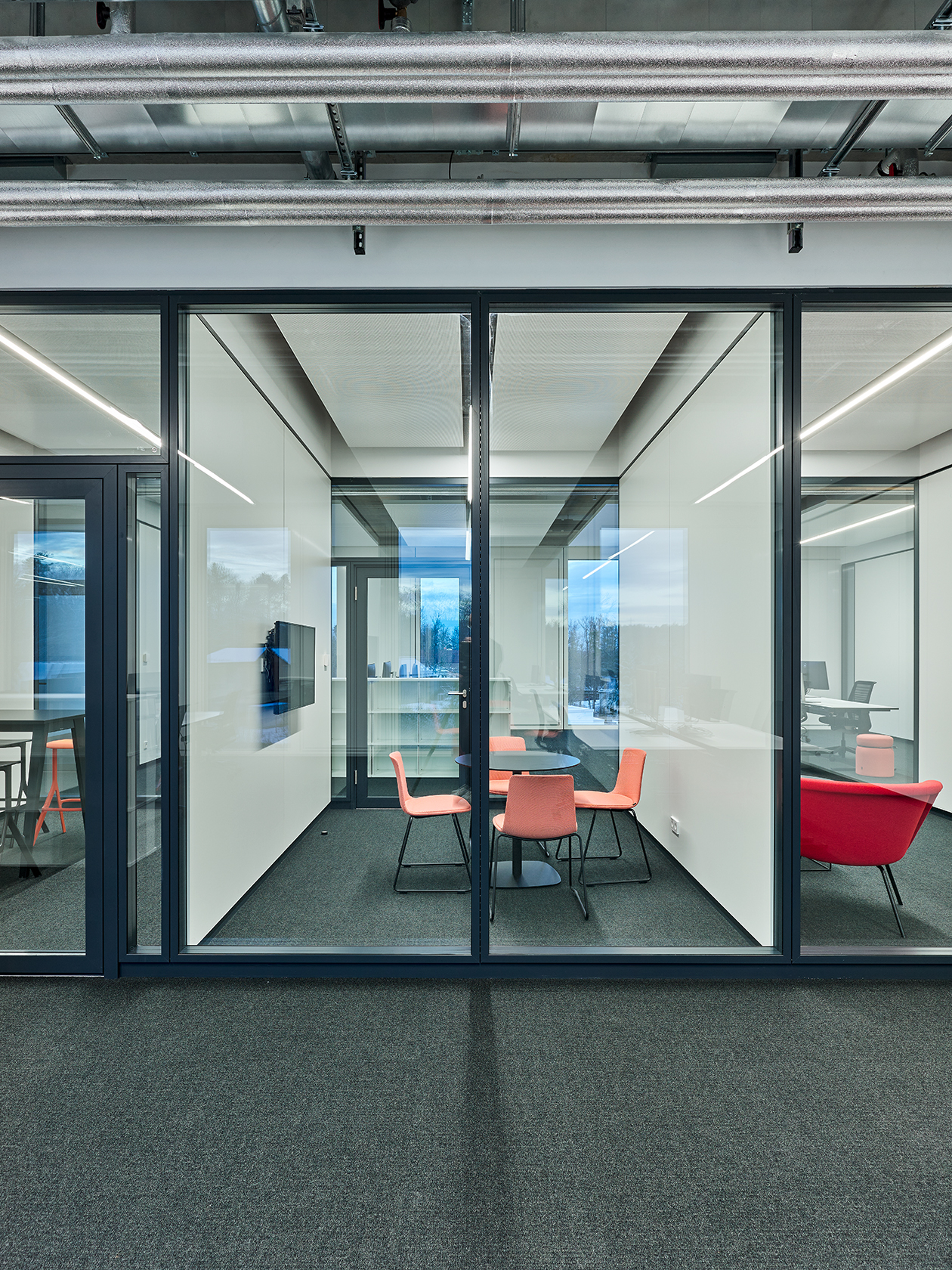 The cradle-to-cradle certified 2000eco and 3400eco partition wall systems from Strähle fulfil the project's economic and environmental requirements and have been installed throughout the building. In order to meet the stringent sound insulation specifications, the double-glazed 2000eco system was used in conjunction with aluminium framed doors.