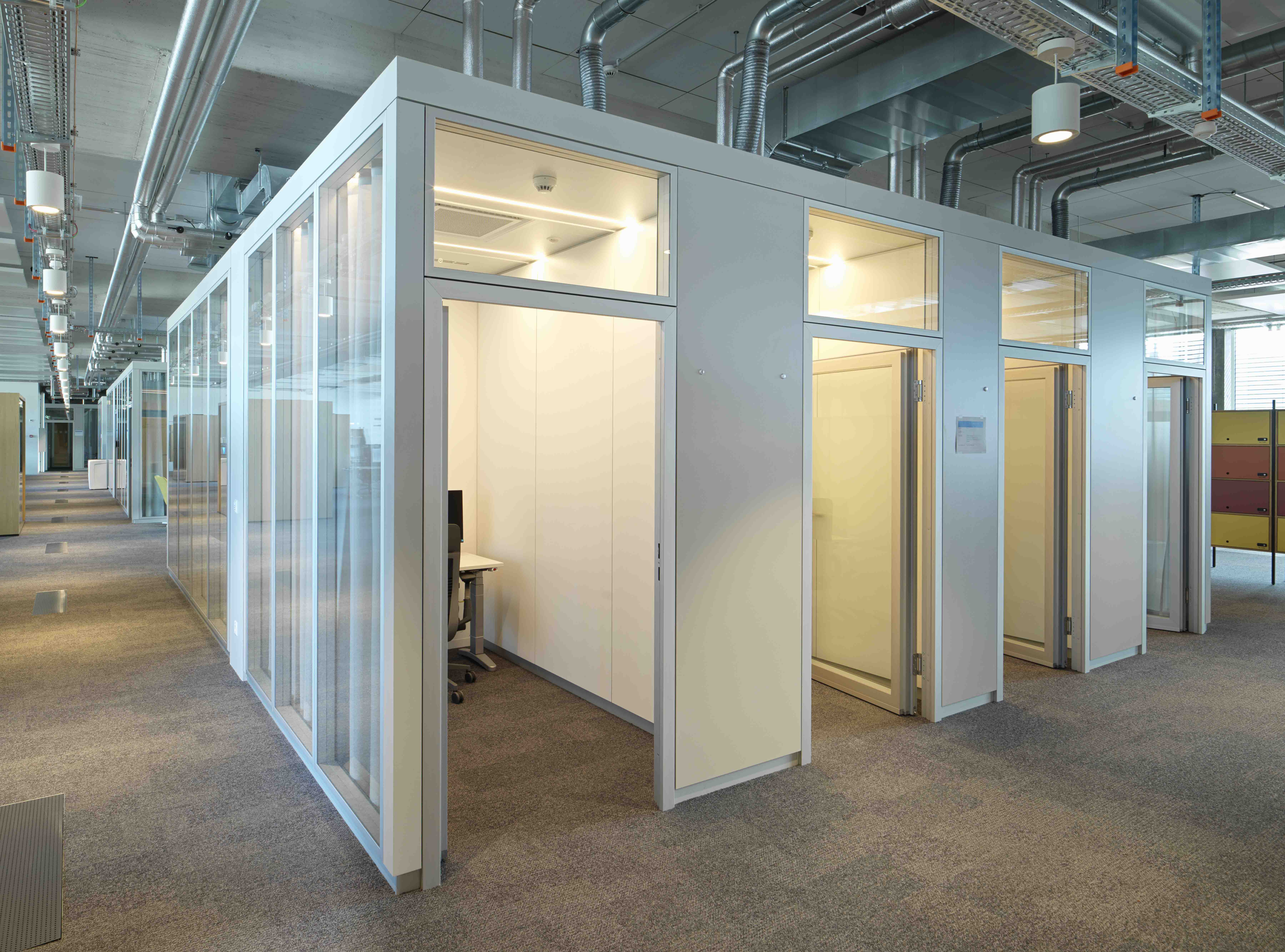At the core of the new interior design is the flexible KUBUS II room-in-room system. Featuring double-glazed walls for superior sound insulation, the system allows for the construction of both individual rooms and multiple adjoining units. Its flexibility is also evident in the integration of building services: the mechanical ventilation was incorporated into the roof structure to ensure optimal air supply and climate control. With KUBUS II, highly soundproofed retreat areas for focused work have been created within the open-plan office space.