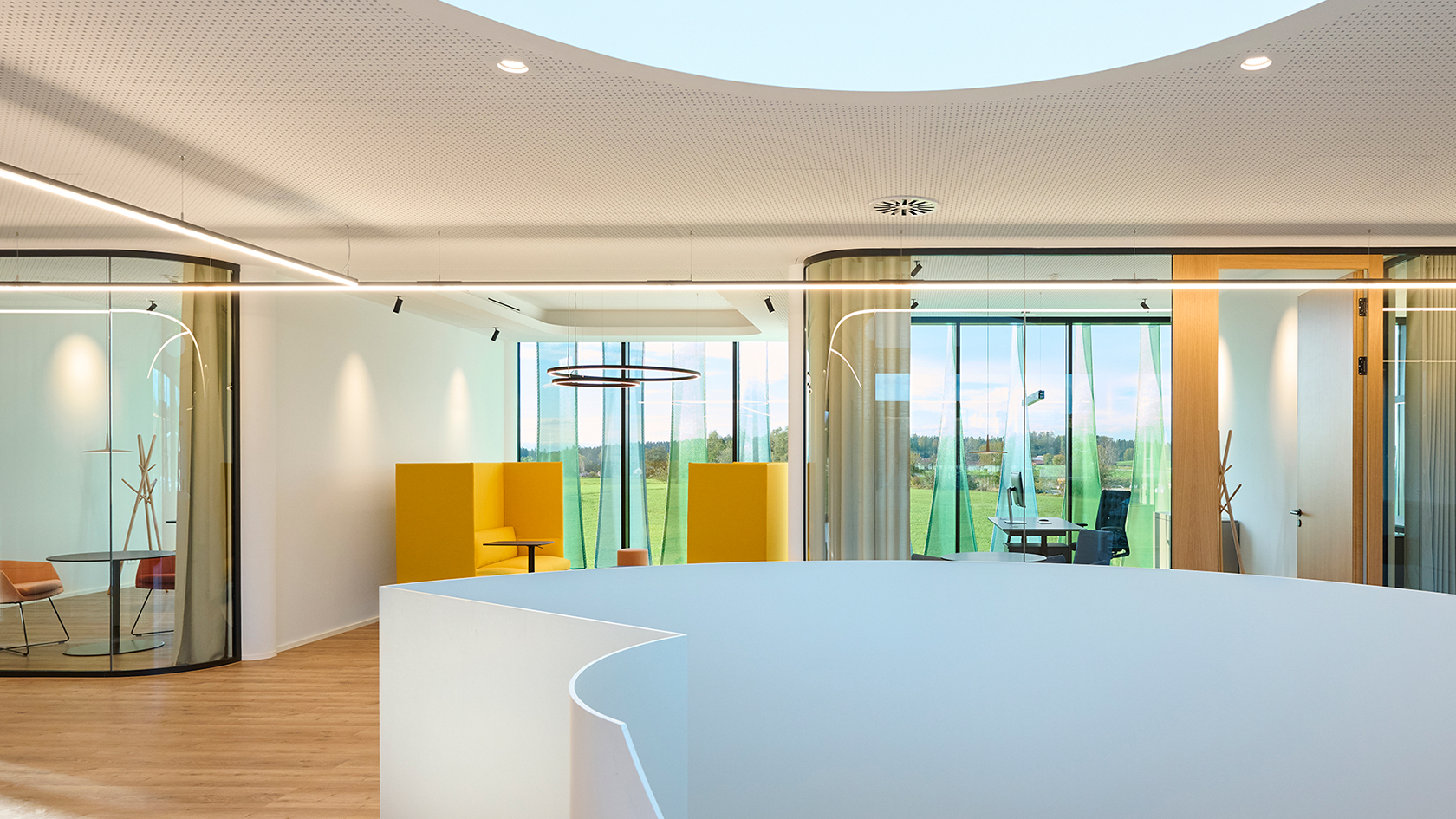 The result is a work environment that equally meets modern demands for communication, concentration, and comfort—executed with technical precision and architectural sophistication. Thanks to the modular design of both the partition wall and room-in-room systems, flexible use remains possible in the future.