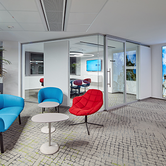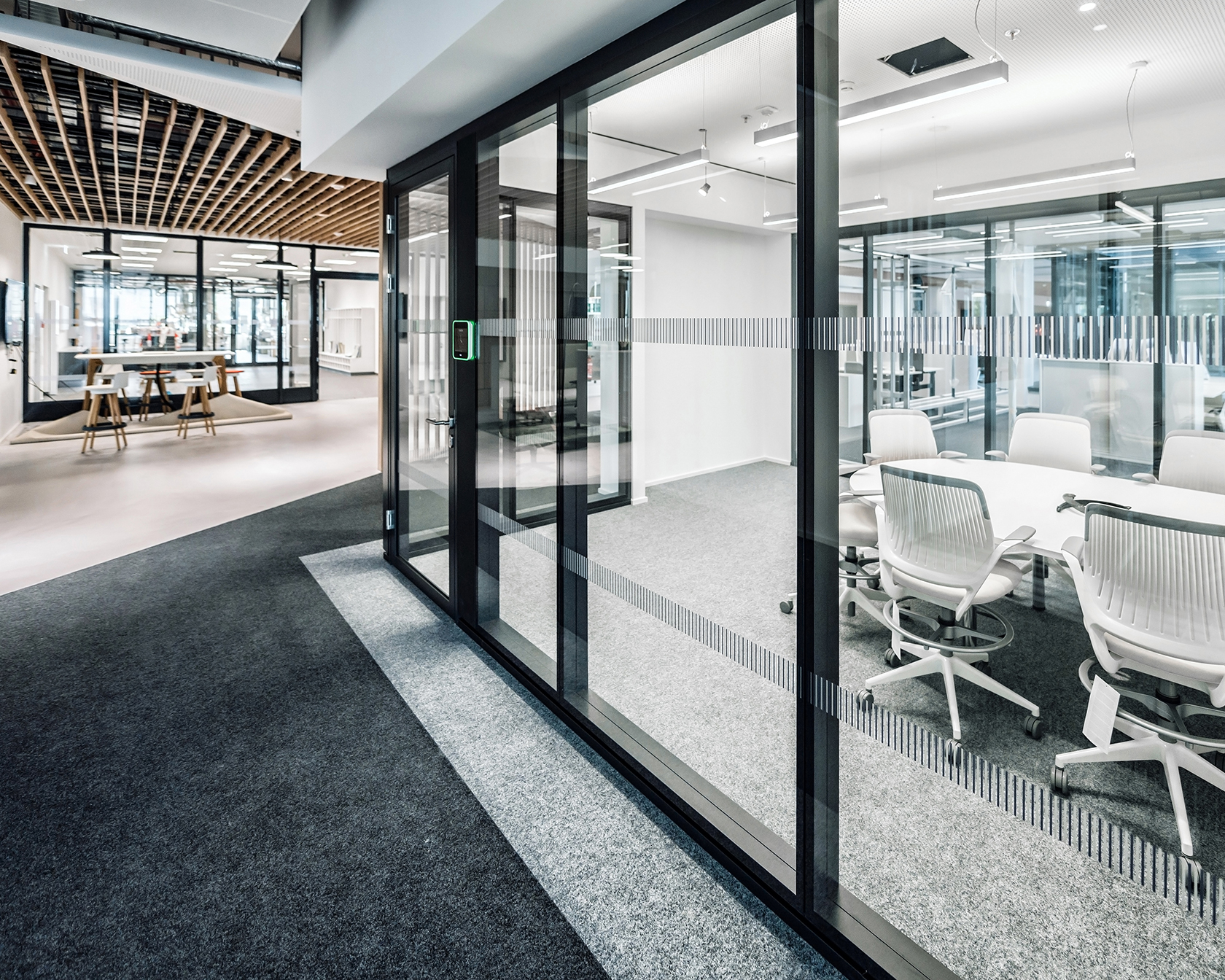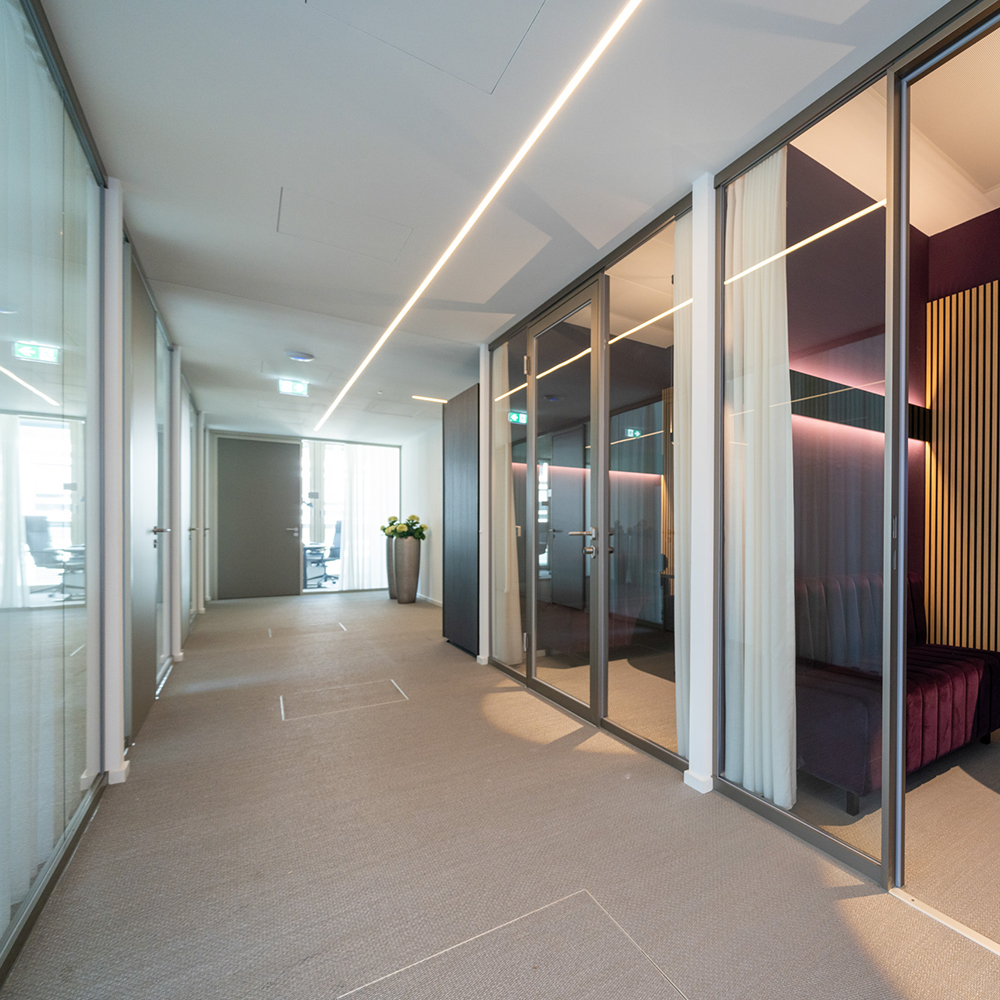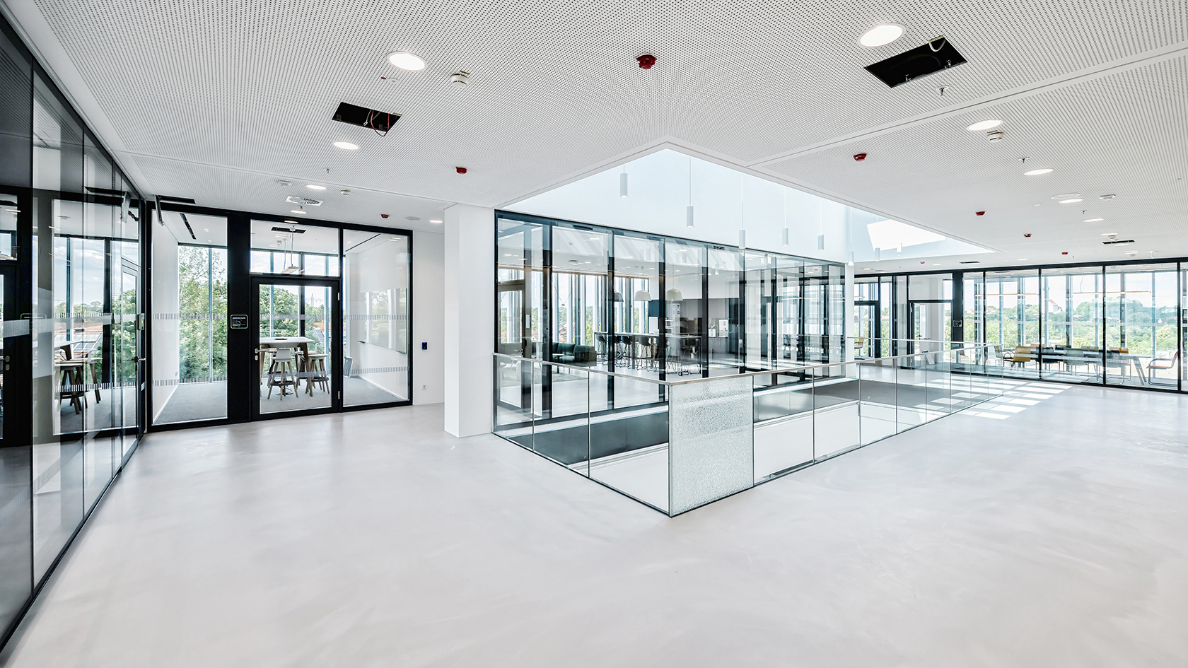 The double-glazed System 2000 partition wall system, complemented by black profiles, has been installed throughout the building. The 100-mm aluminium frame doors have been fitted flush on both sides, creating an enhanced noise barrier. Room booking systems have been incorporated into the door side sections, allowing the rooms to be controlled digitally. Two balustrade walls 10 and 12 metres in length enclose the stairwell and strike a balance between transparency and privacy from the corridor areas to the rooms. All in all, the result is an airy and inspiring centre featuring an ultra-modern infrastructure.