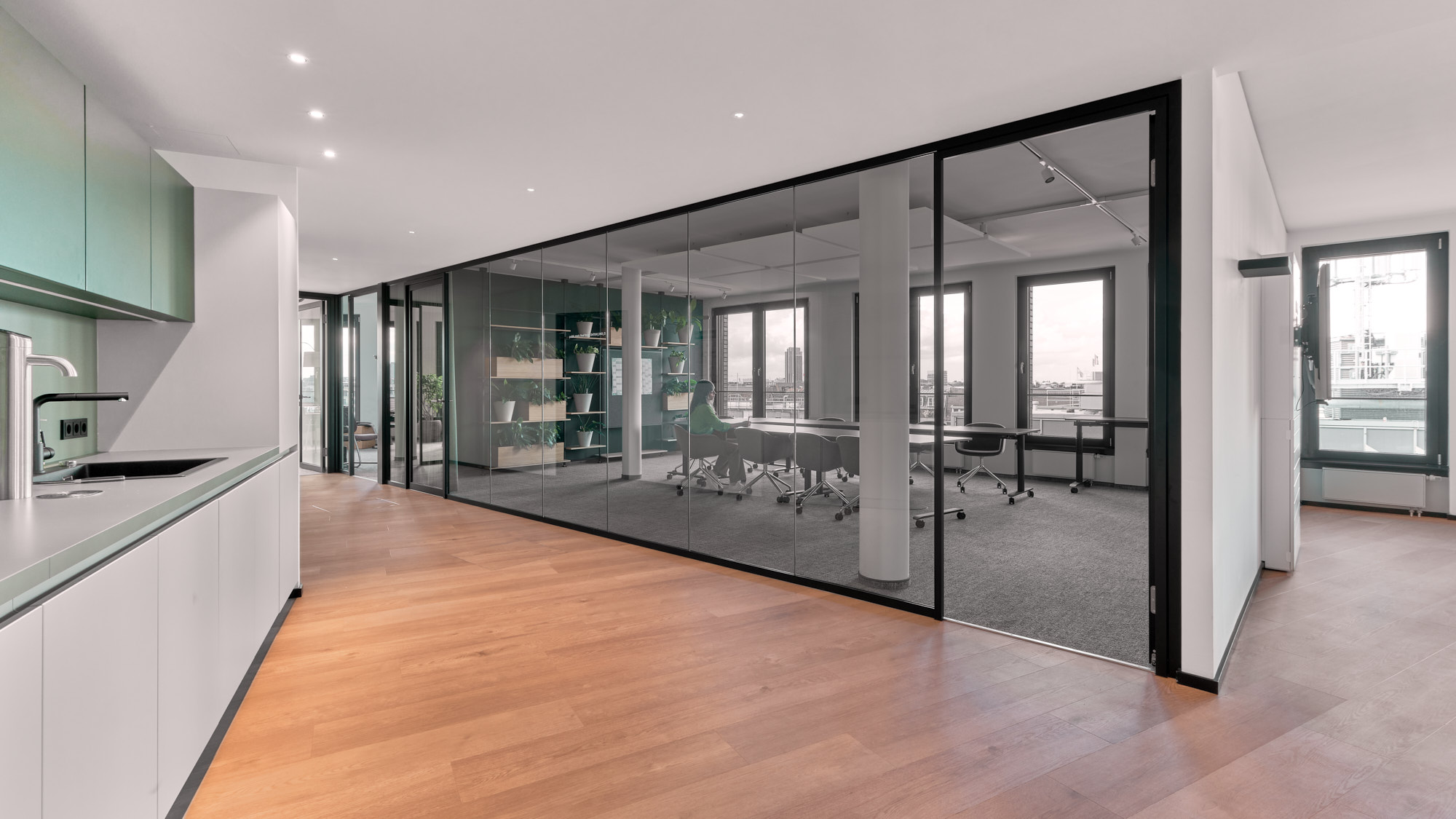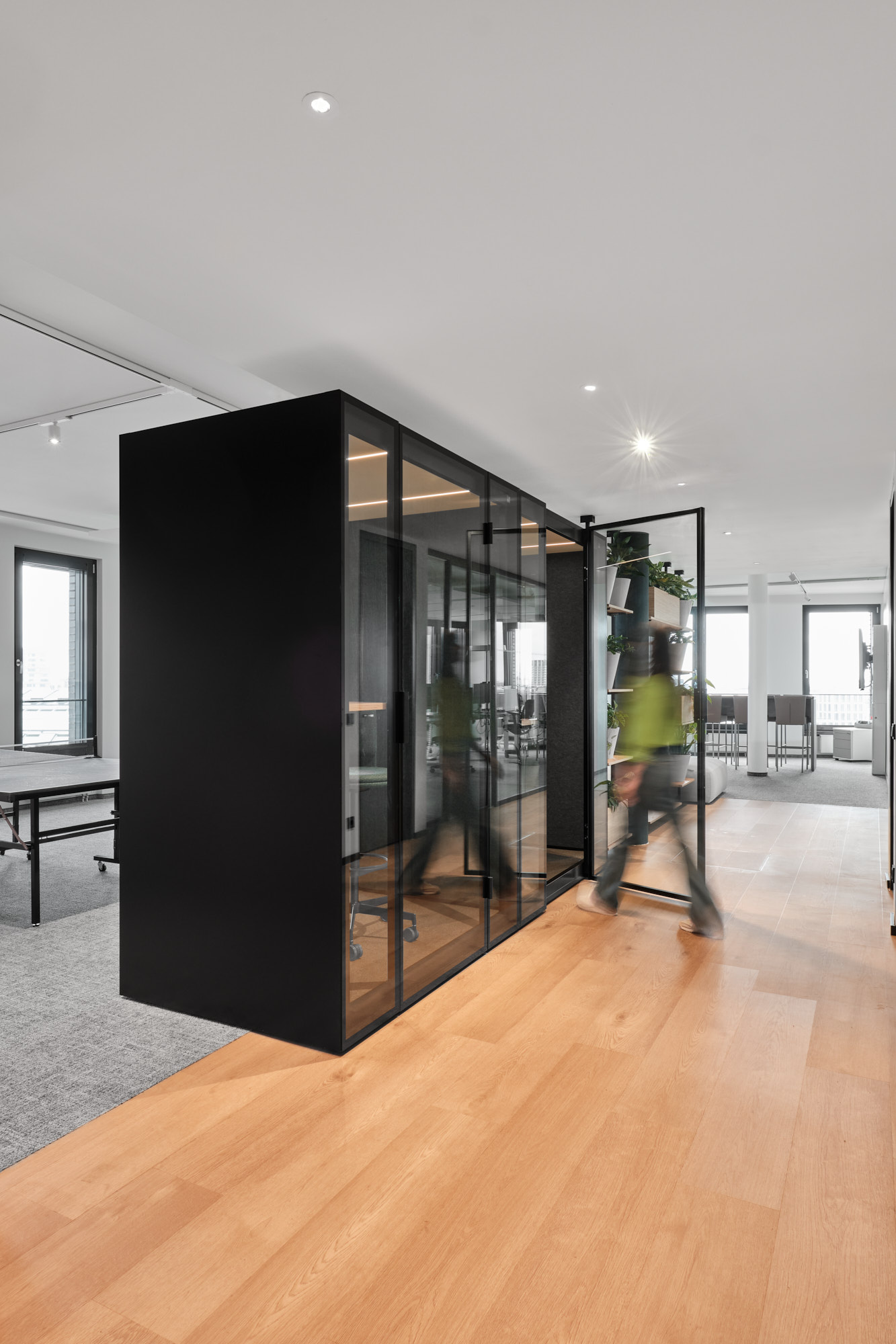 Different curtain colors and the integration of plants create a warm and homely atmosphere. The black profiles of the glass walls are consistently aligned with the flush-mounted profiles of the TEAMBOXES, resulting in a cohesive and refined overall design.