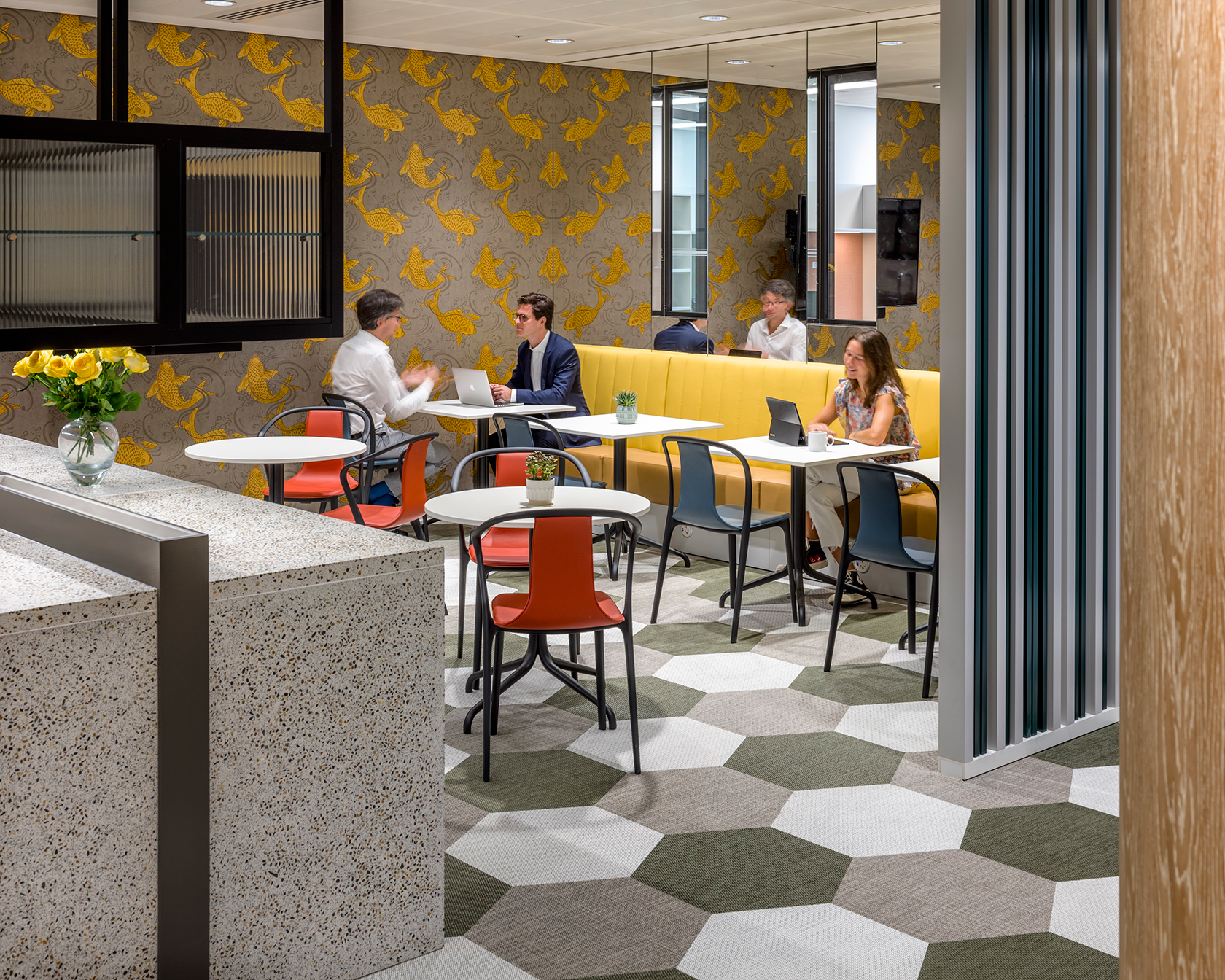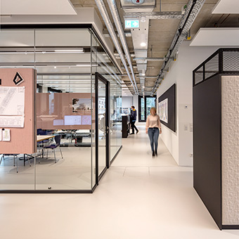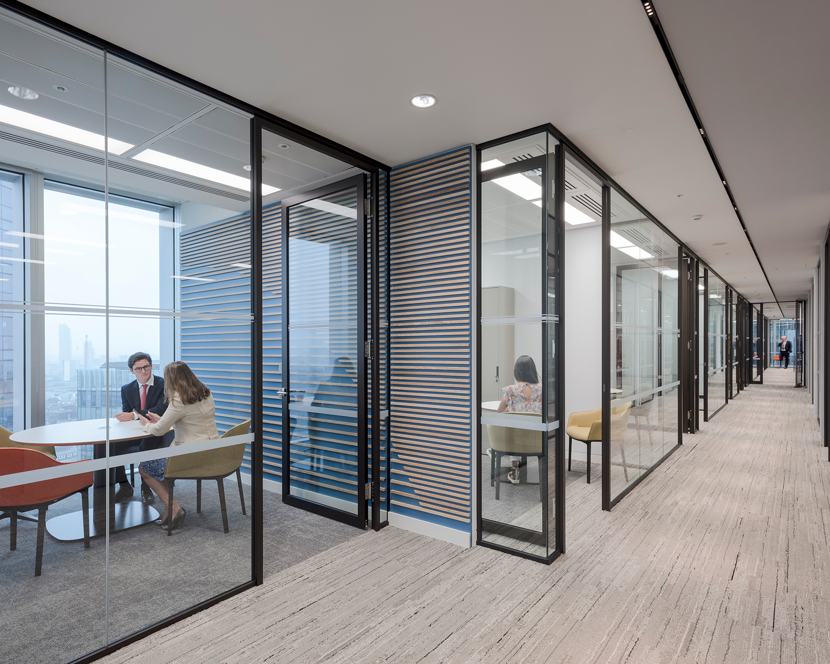 The London-based law firm’s new offices were outfitted with Strähle partition walls by our UK partner, Savile Row Projects. All-glass System 3400 and System 3500 partitions in anodised black define the different zones of the office. The double-glazed System 3500 provides exceptional sound insulation, perfect for keeping conversations and confidential meetings private. The office’s conference rooms all feature these elegant, transparent partition systems. Employee offices were created with single-glazed System 3400. Coloured accents on the walls and floors separate communal areas like the canteen and lounge area from office spaces.