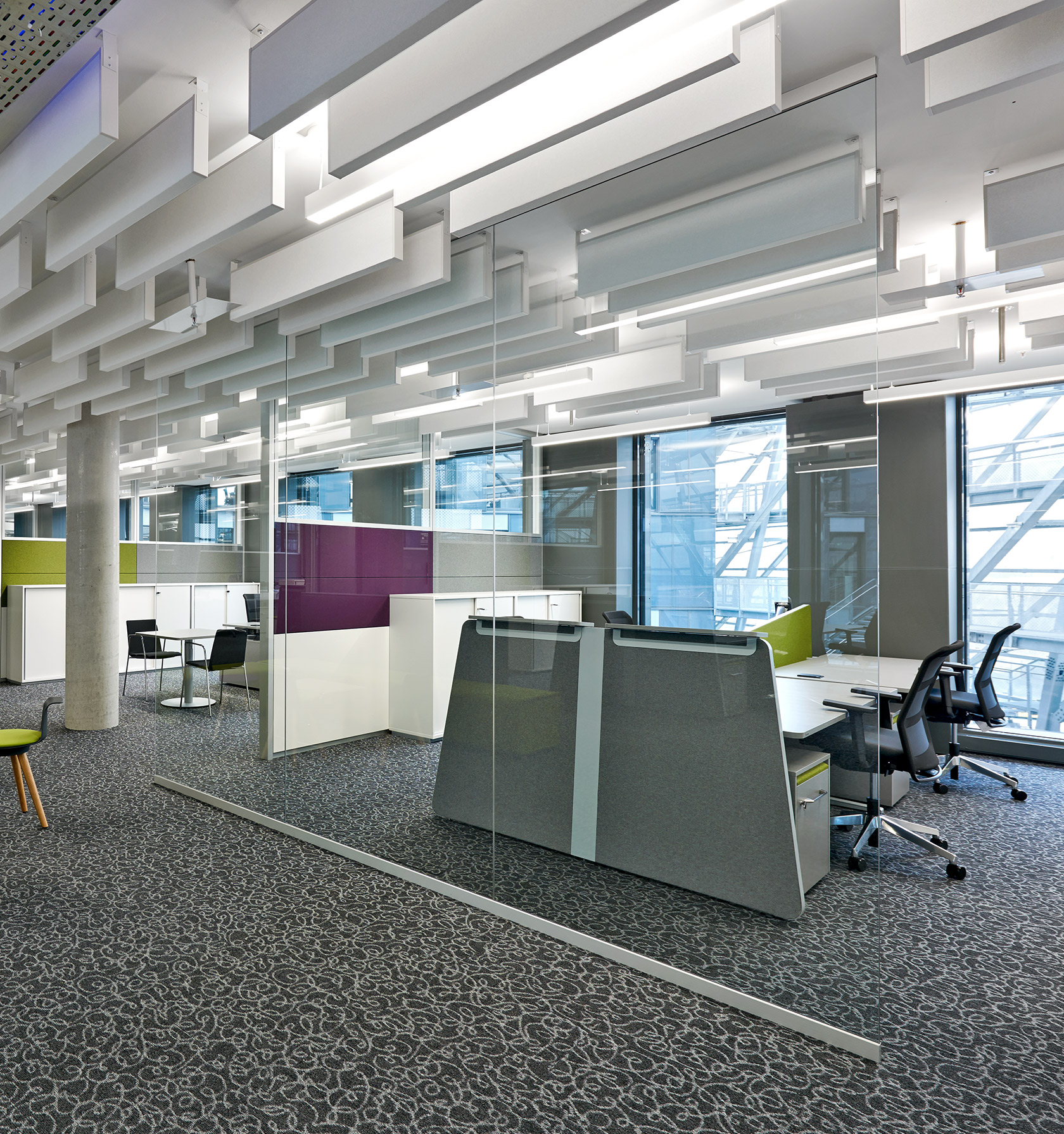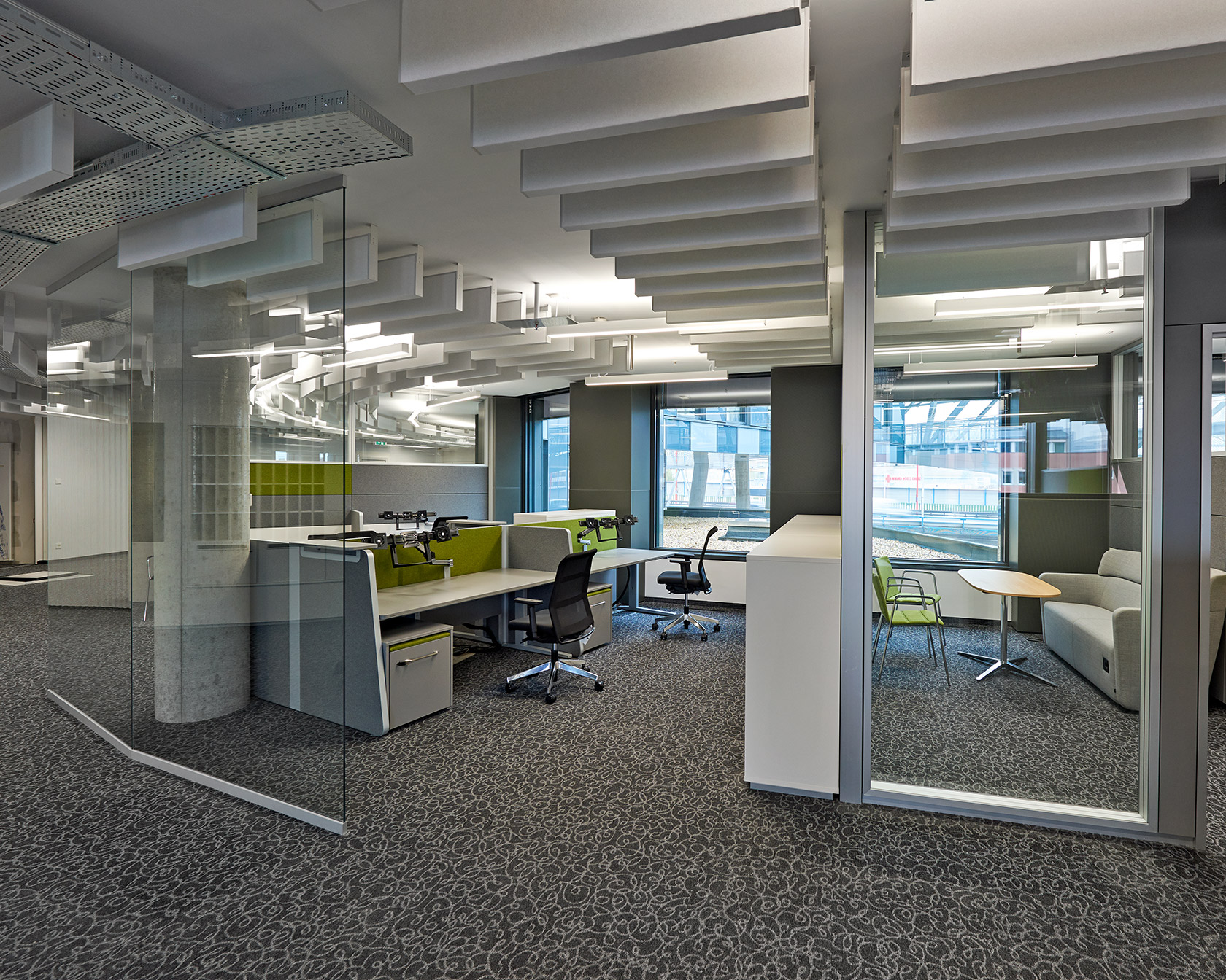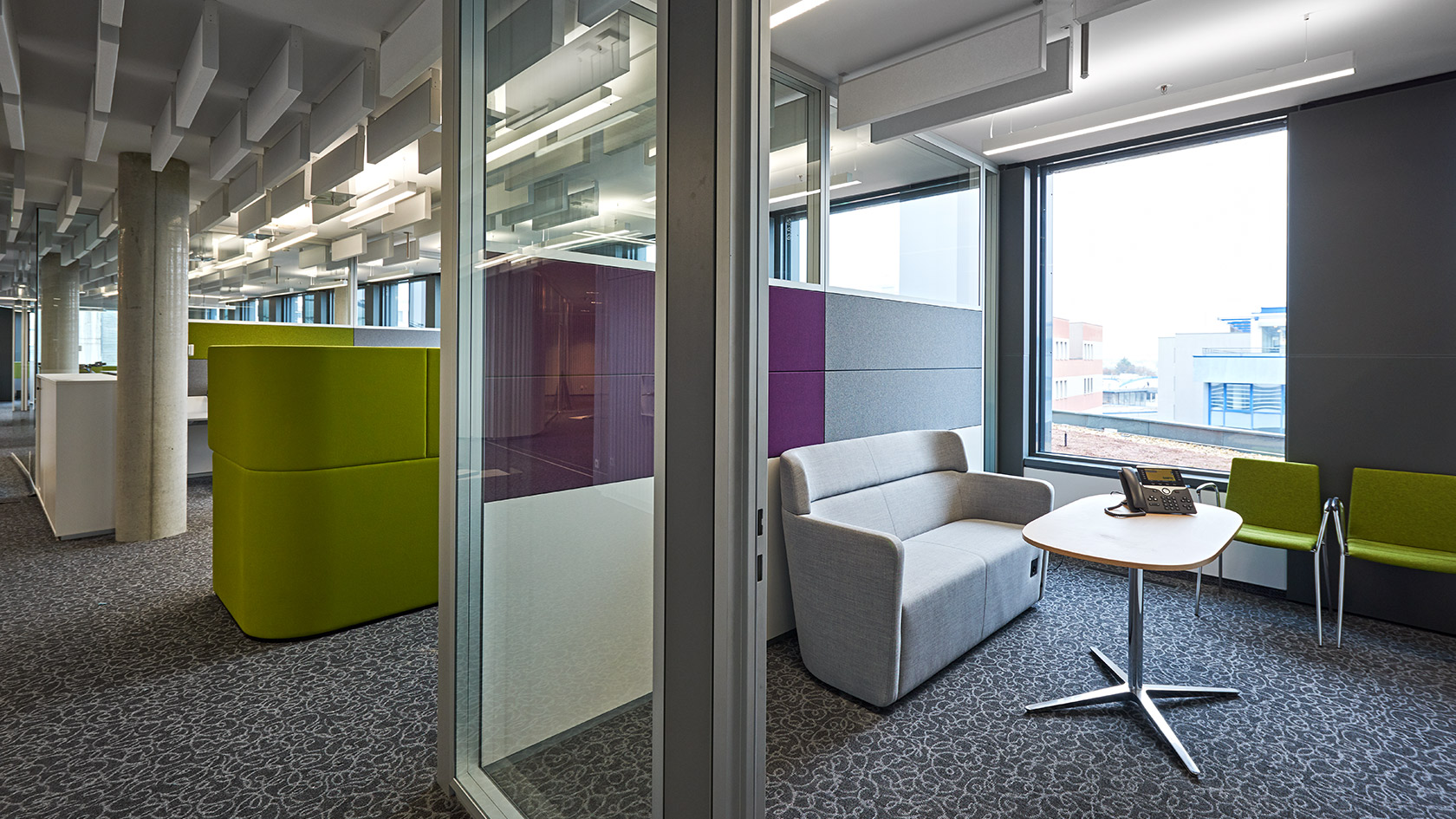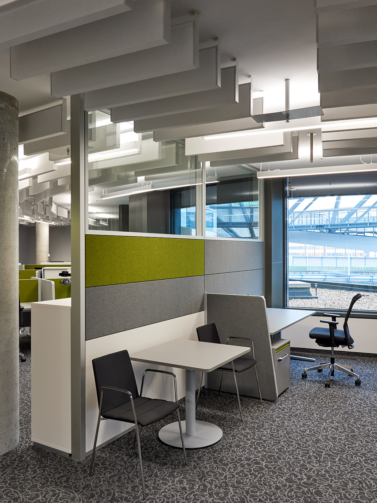 The architecture firm Pichler & Traupmann implemented the concept with open, transparent, staff-oriented spatial conditions. Partition wall systems from Strähle with integrated absorbers and a variety of coloured textiles for excellent acoustics were used in the open areas. This created a zoning of the workplaces and improved the acoustics for the staff. Alternating open and closed work areas enable a wide variety of uses for the office space.
