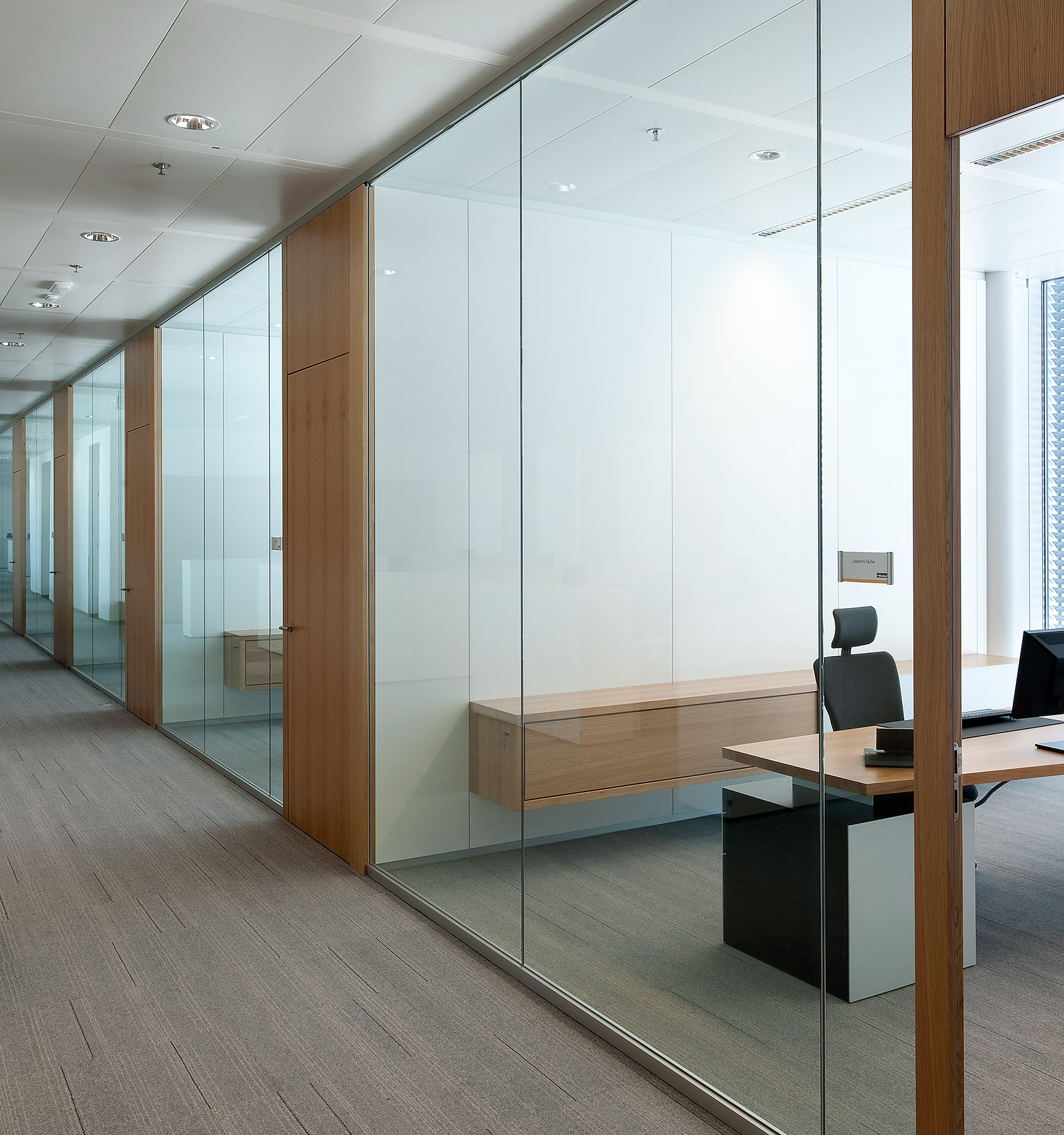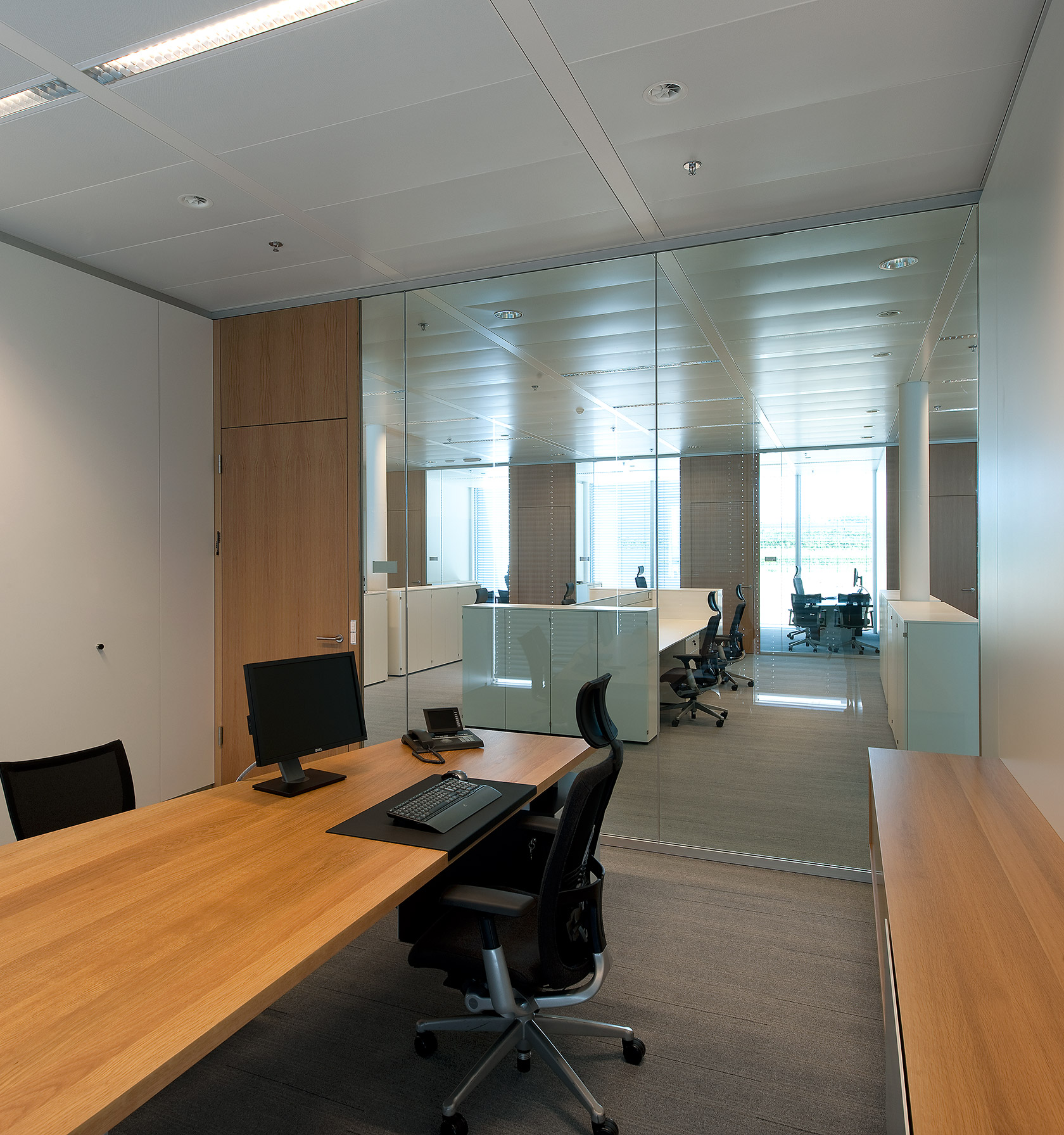 The workstations are installed in individual offices along the facades, as well as in open-space areas in the central zone. The System 3400 all-glass partition walls provide a great sense of transparency, while the wood surfaces on the doors create a warm atmosphere. The conference and training rooms were fitted with the double-glazed partition systems 2000 and 2300.