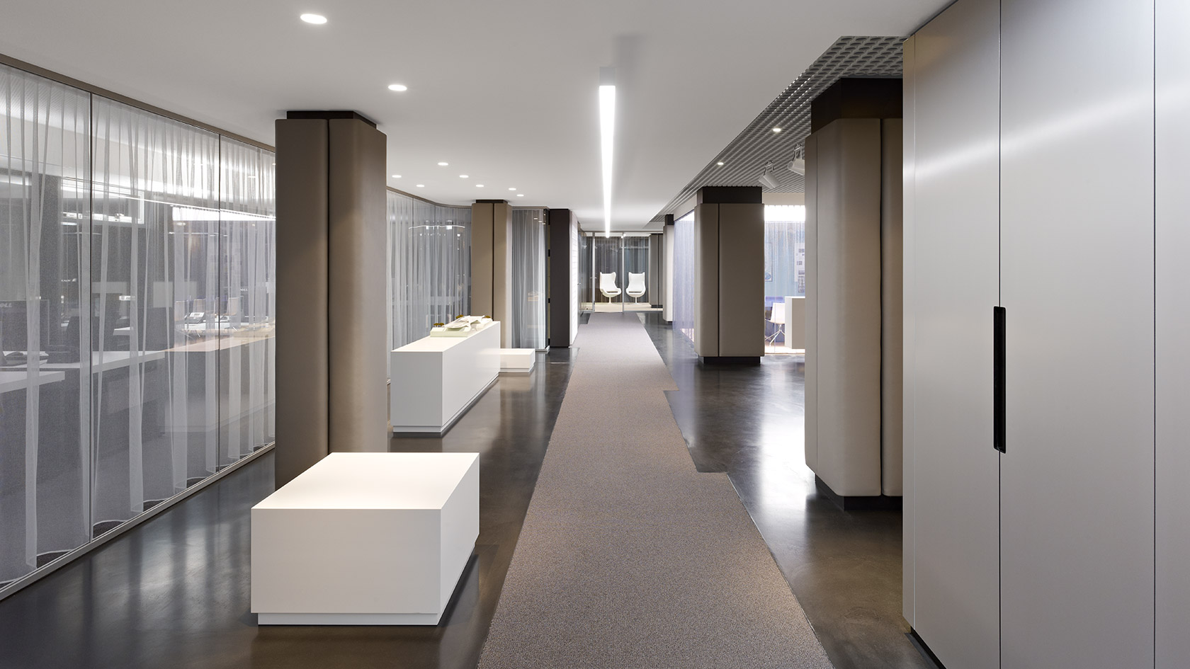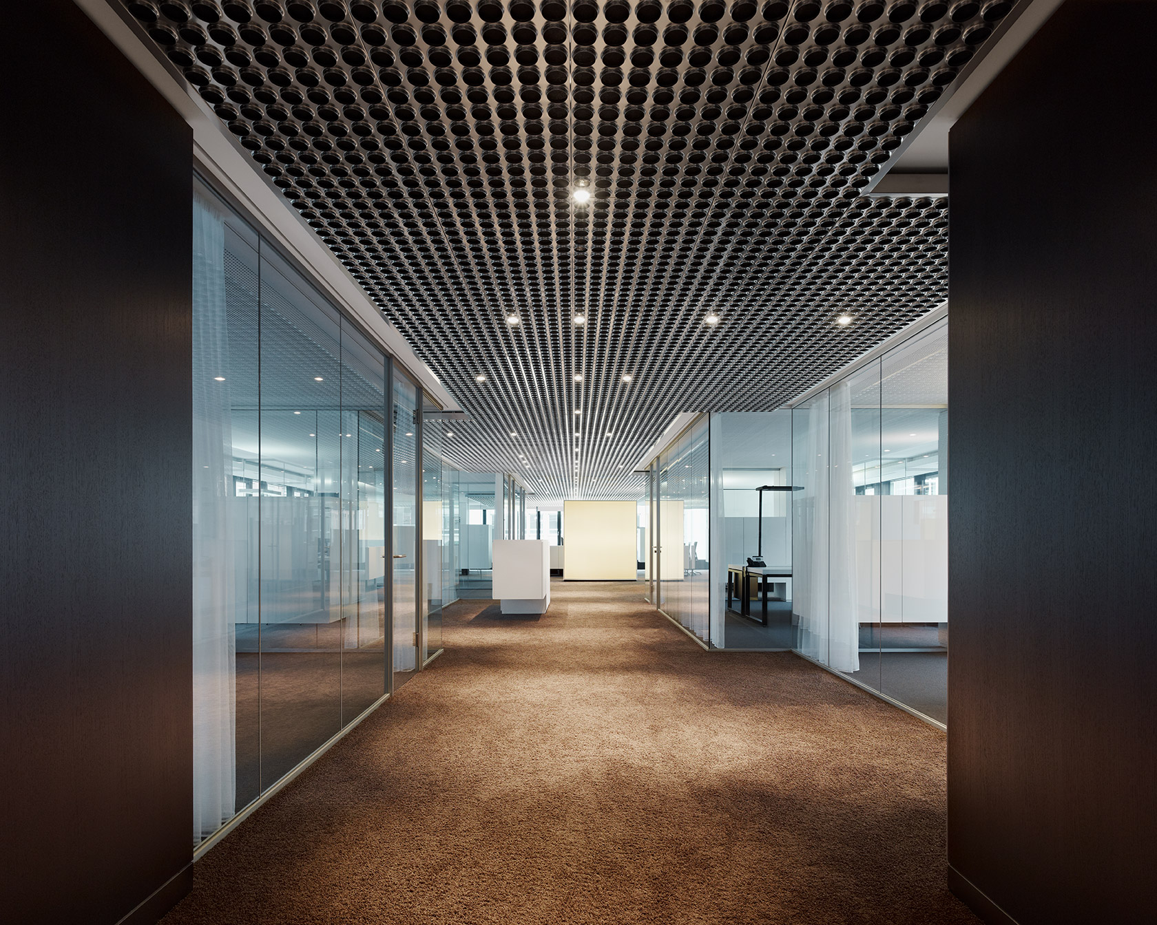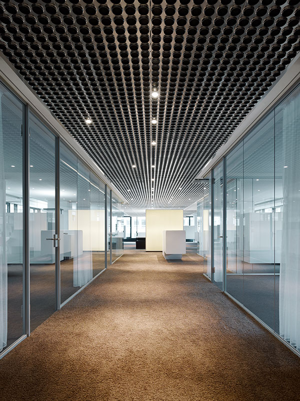 The new main headquarters of the international engineering office schlaich bergermann and partner is located in the west of Stuttgart. The interior design of the revitalized seven-storey office building from the 1970s is defined by its transparent room structures. Strähle‘s System 3400 from was used to separate the offices and conference rooms from the open workspaces. Due to the relatively low ceiling height, the architects of the Ippolito Fleitz Group were careful to reduce the heights of the floor and ceiling sections to a minimum. The twopart aluminium sections of the System 3400 make installation easy. The variable sections were glazed either with 16 mm thick laminated safety glass or 10 mm thick toughened safety glass depending on their sound insulation requirements. Used together with acoustic film, the laminated safety glass attains a sound insulation value of 41 dB (Rwp).