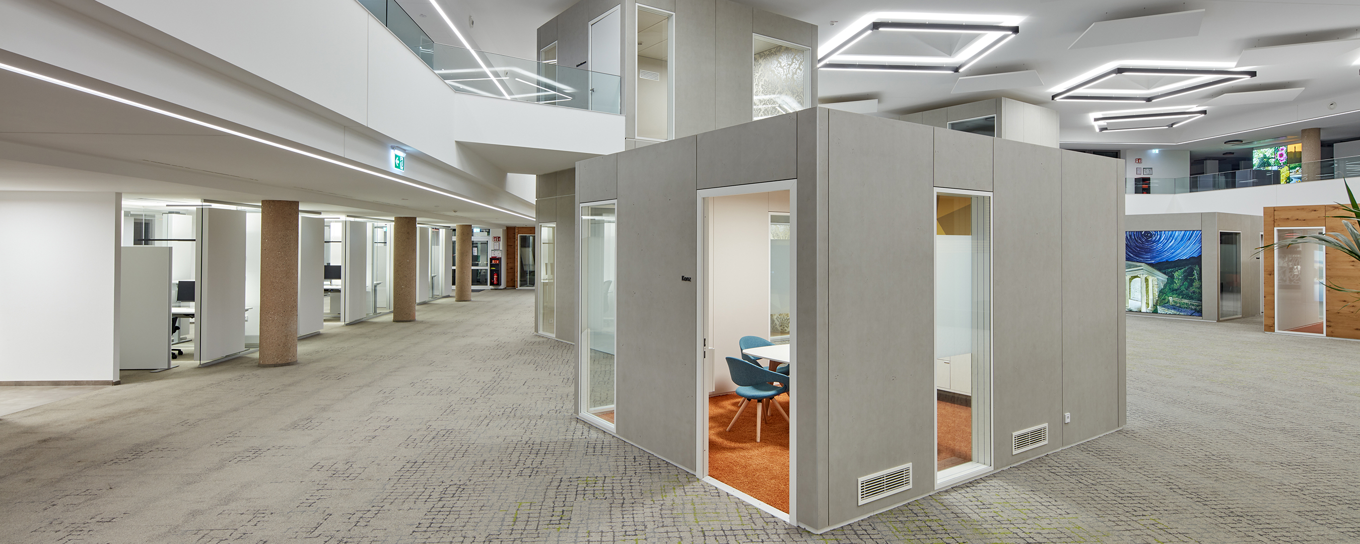 Multi-purpose rooms have been created to foster communication, fuel teamwork and facilitate focused work. To meet the high acoustic and design requirements, partition walls, room-in-room modules and acoustic systems – all provided by Strähle – were the solution of choice. Customers coming in for advice can make use of the ten closed cubes from the Kubus range and three quick consultation stations that have been installed on the ground floor. The new open-space design lets plenty of natural light in and its modern features are pleasing to the eye – all while maintaining confidentiality through the use of noise barriers and privacy screens. The employee workstations are located on the upper floors. The offices have been partitioned using the System 7400 glass acoustic wall – a combination of glazing and soundproofing elements – meaning that the spaces can be flexibly adapted to changing user requirements without the need for extensive building work. The design features 600 linear metres of glass acoustic wall and more than 1,000 absorber elements, with 150 additional freestanding absorbers rounding off the acoustic concept.
