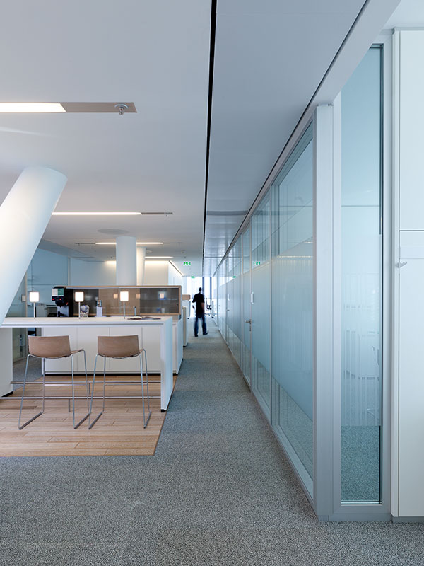 The idea of fostering dialogue and knowledge-sharing among the 2,000-plus employees was pursued consistently in every aspect of the interior design, and the walls played a major role. They were designed to direct light into the building's interior while at the same time aiding concentration and providing good room acoustics. Another key brief was that the walls should be easy to move, enabling the company to respond flexibly to organizational changes. With its partition wall system 2000, which offers countless possibilities, and the associated sound absorber system, Strähle emerged as the winner in the extensive tests. Of the total 7,000 running meters of partition walling, around half consist of ceiling-to-floor, all-glass elements lining the corridors, while the remaining 3,500 meters separate the offices from one another.